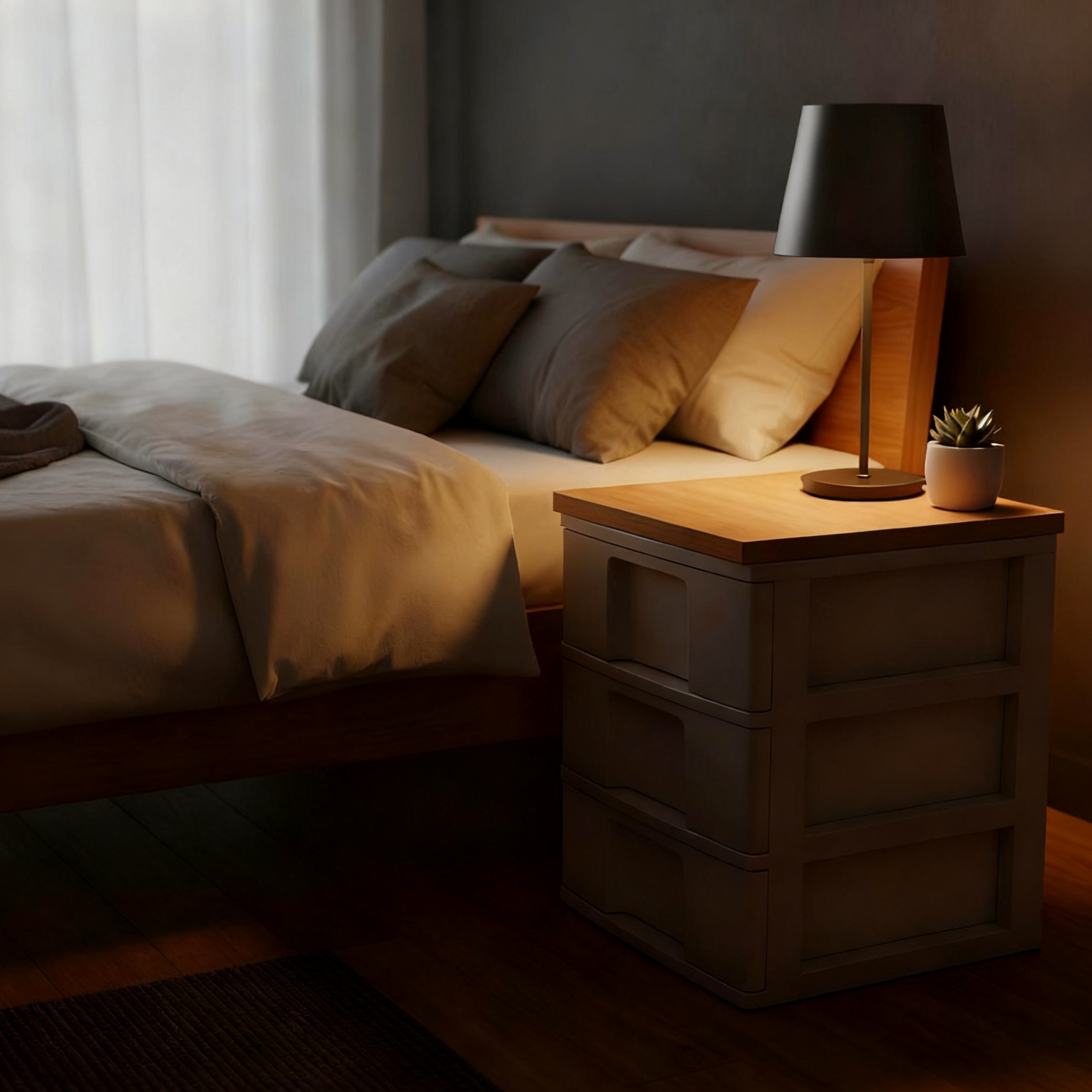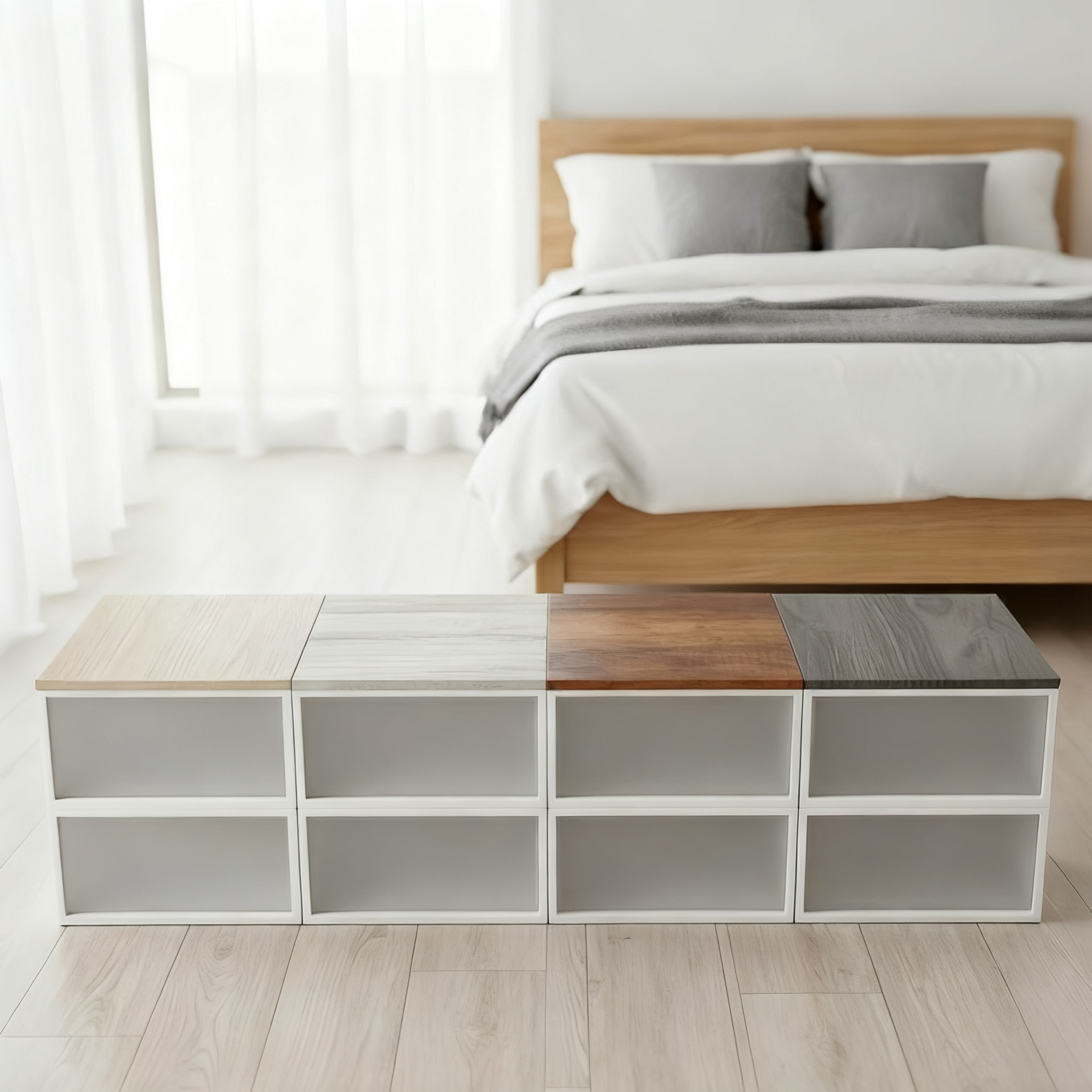 視覺轉換:一片顏色和紋理優美的木質頂板,能立即遮蓋塑膠收納箱頂部的雜亂感,讓收納櫃體看起來更像北歐風或日系風格的精緻邊櫃。