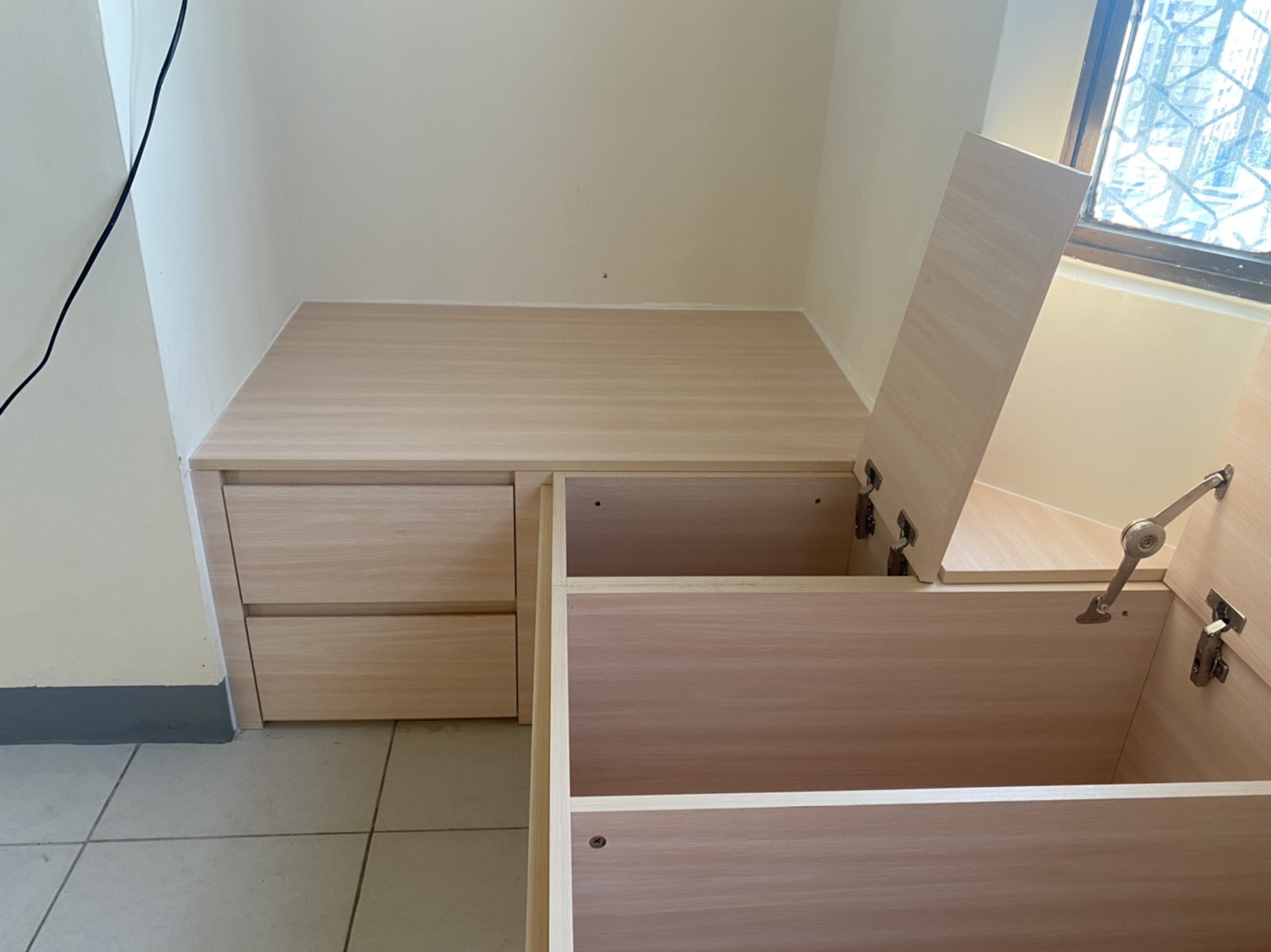 我們為客戶量身打造的窗邊臥榻收納櫃,不僅實現了坐在窗邊享受陽光、欣賞風景的夢想,更將每一寸深度空間都發揮到極致。這座多功能的櫃體結合了前方抽屜與後方上掀式設計,無論是雜物、衣物或書籍,都能妥善收納,徹底解決空間不足的困擾。