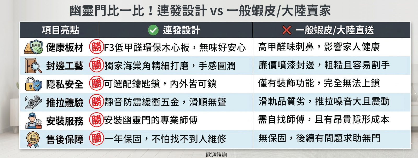 仔細比較連發設計幽靈門和大陸直出貨的優缺點,不論是在健康板材(F3低甲醛環保木心板)、封邊工藝(手感圓潤的海棠角)、隱私安全(可選配內外皆可鎖的鑰匙鎖)、推拉體驗(靜音緩衝)、安裝服務(專門安裝幽靈門的師傅)、售後保障(一年保固不怕找不到人),每一項都勝出!