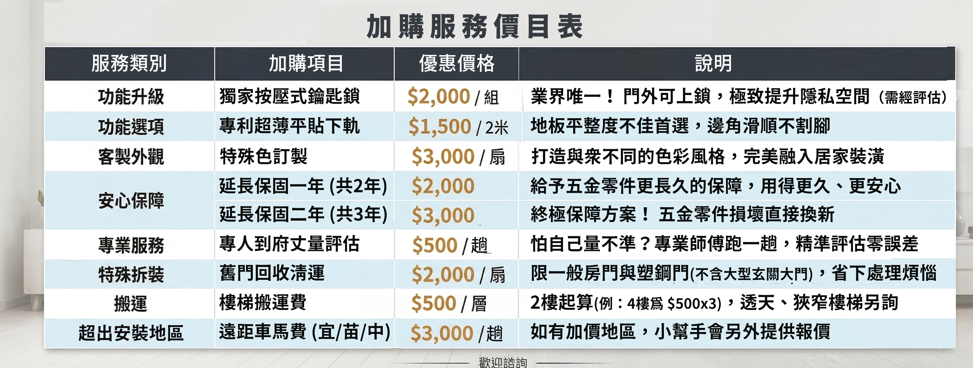 為了提供最完整的安裝體驗,我們提供以下加購選項,請依個人需求選擇: